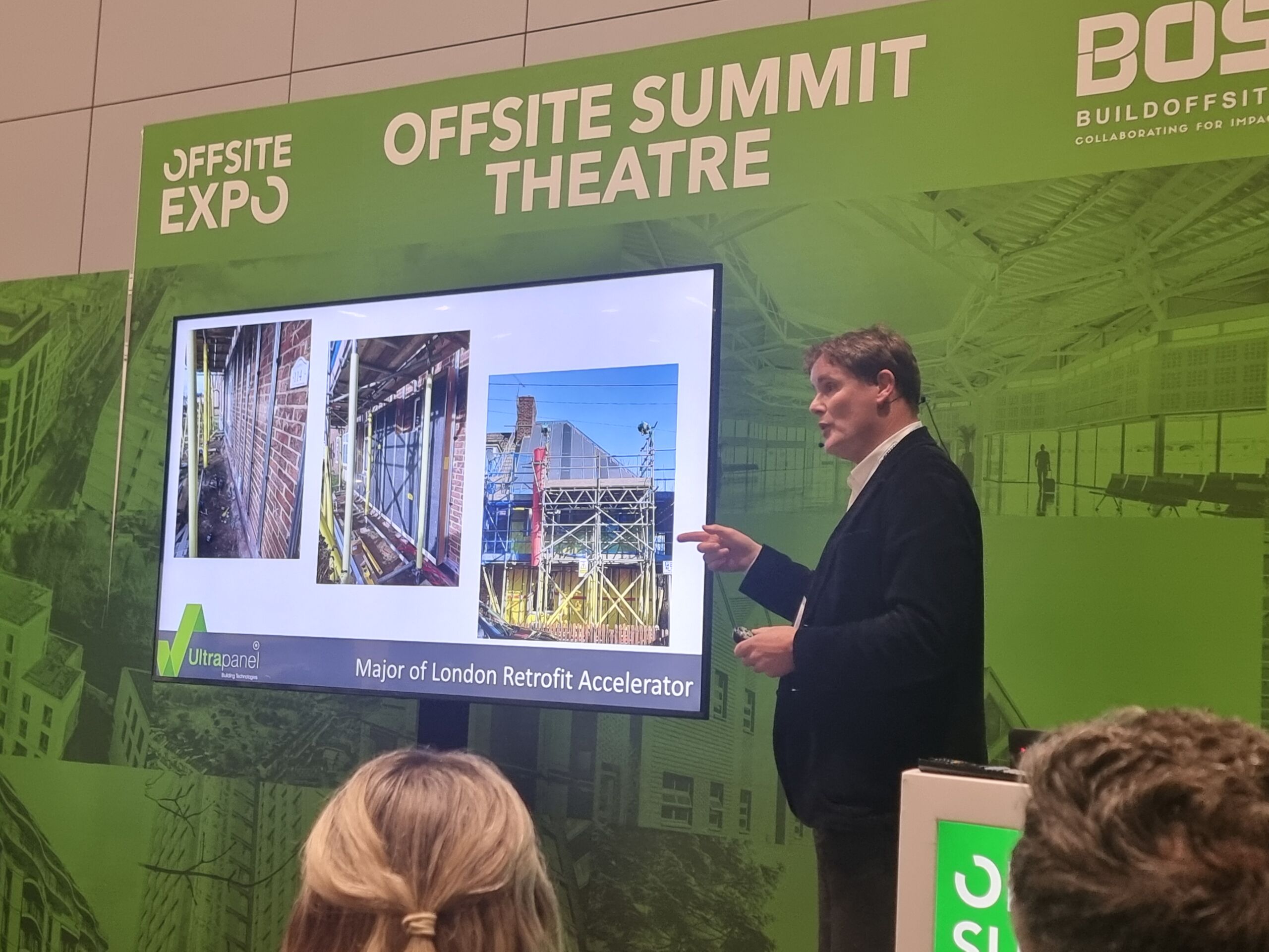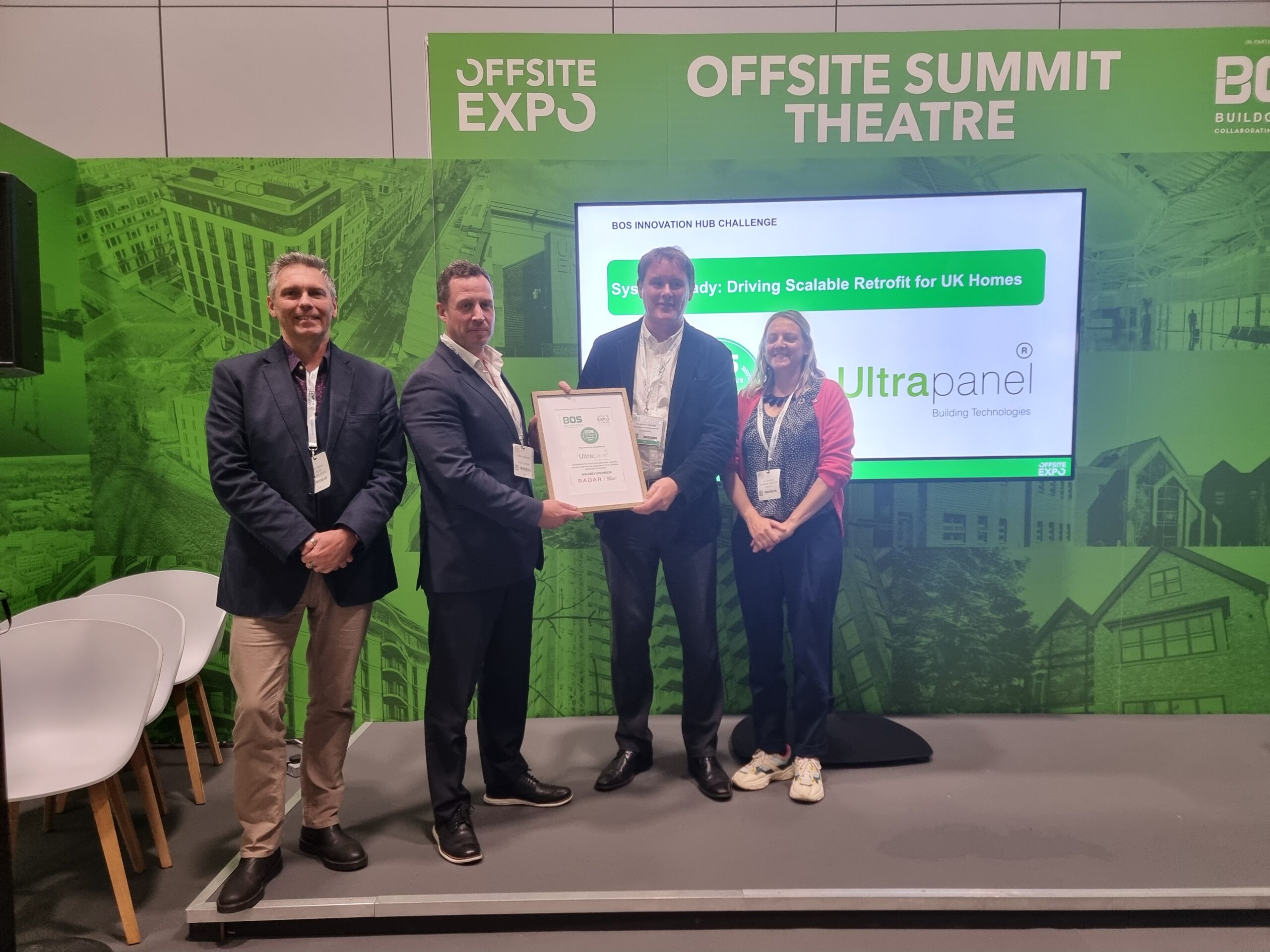 Hosted by Steve Chesters of HadleyFRAME, the challenge saw finalists pitch their retrofit innovations to a live audience and a panel of expert judges: Ele George, Gary Ramsay, and Jackie Maginnis. The Ultrapanel team’s clarity, engineering precision, and scalability made their pitch stand out.